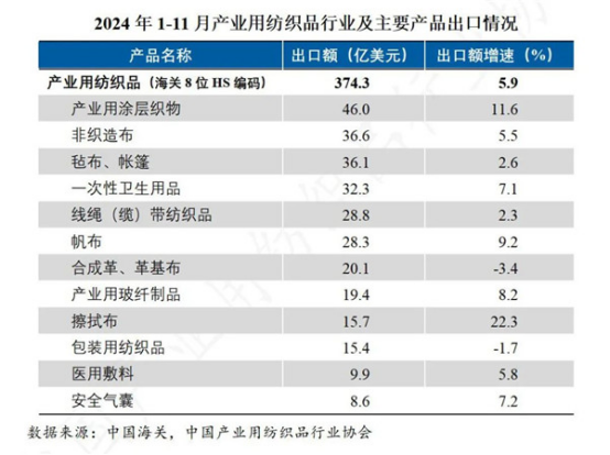 國際貿(mào)易方面,根據(jù)中國海關(guān)數(shù)據(jù)(海關(guān)8位HS編碼統(tǒng)計數(shù)據(jù)),2024年1-11月產(chǎn)業(yè)用紡織品行業(yè)出口額為374.3億美元,同比增長5.9%;進(jìn)口額為46.1億美元,同比下降3.6%。