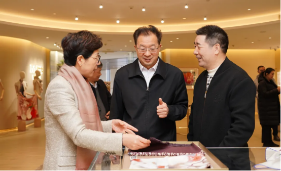 1月10日,工信部消費(fèi)品工業(yè)司司長(zhǎng)何亞瓊一行調(diào)研萬(wàn)事利絲綢歷史經(jīng)典產(chǎn)業(yè)創(chuàng)新發(fā)展。浙江省經(jīng)信廳總工程師李永偉,杭州市經(jīng)信局黨組書記、局長(zhǎng)王越劍,上城區(qū)委常委、副區(qū)長(zhǎng)孔德君等相關(guān)領(lǐng)導(dǎo)陪同調(diào)研。