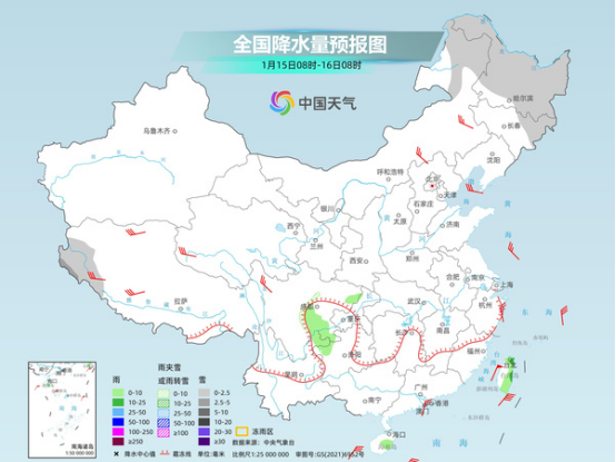 明天,我國(guó)降水天氣將繼續(xù)縮減,內(nèi)蒙古東北部、黑龍江大部、吉林東北部、西藏西部等地部分地區(qū)有小雪或雨夾雪,其中,西藏西南部部分地區(qū)有中雪。四川盆地東部和南部、貴州西北部、云南東北部、海南島東南部、臺(tái)灣島東部等地部分地區(qū)有小雨。