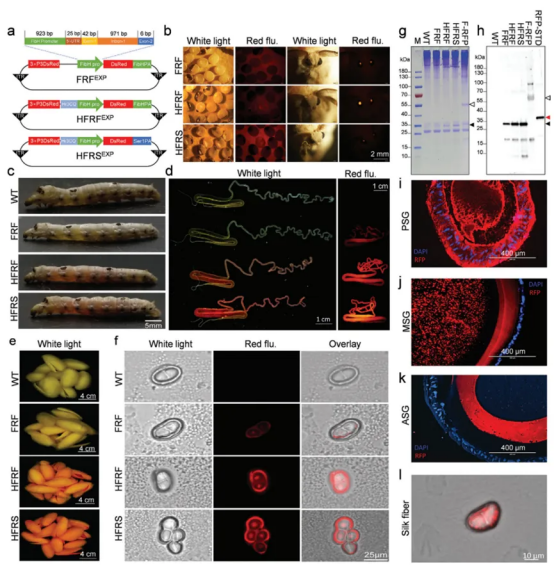 如圖2a所示,為了實(shí)現(xiàn)外源基因在家蠶后部絲腺(PSG)中的時(shí)空特異性和高效表達(dá),研究者從家蠶基因組中擴(kuò)增出了一個(gè)1967 bp長(zhǎng)度的基礎(chǔ)Fib-H啟動(dòng)子,將紅色熒光蛋白(RFP)的編碼序列(CDS)和Fib-H轉(zhuǎn)錄終止子(FibHPA)依次連接到基礎(chǔ)Fib-H啟動(dòng)子下游,插入pBac轉(zhuǎn)基因載體,形成基本的Fib-HEXP系統(tǒng)(FRFEXP)。為提高FRF的轉(zhuǎn)錄效率,研究者在基礎(chǔ)Fib-H啟動(dòng)子上游添加一個(gè)hr3CQ增強(qiáng)子,形成HFRFEXP系統(tǒng);為進(jìn)一步提高外源基因的mRNA穩(wěn)定性,研究者將FibHPA替換為Ser1PA轉(zhuǎn)錄終止子,形成最終的HFRSEXP系統(tǒng)。隨后,將以上三個(gè)系統(tǒng)微注射到家蠶胚胎中,生成可持續(xù)表達(dá)RFP的可遺傳轉(zhuǎn)基因家蠶。與FRF系統(tǒng)相比,HFRS和HFRF系統(tǒng)表達(dá)的RFP分別增加了7.2倍和4.1倍,表明優(yōu)化后的HFRSEXP實(shí)現(xiàn)了天然分子量的重組蛋白在PSG中的高效表達(dá)并分泌到絲纖維中(圖2c-g)。