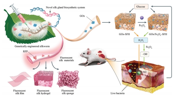 家蠶的絲腺能夠合成大量高分子量的絲素蛋白,形成絲素纖維,被認(rèn)為是一種生物反應(yīng)器,可將外源蛋白整合進(jìn)絲素纖維,制備功能性蠶絲生物材料。最近,受益于基因技術(shù)的應(yīng)用,絲腺有望成為大規(guī)模生產(chǎn)外源蛋白的生物反應(yīng)器。Fib-H基因表達(dá)系統(tǒng)能夠超高效合成絲纖維蛋白,是最有前途的合成外源性蛋白的系統(tǒng)。然而大多數(shù)用Fib-H系統(tǒng)表達(dá)的外源蛋白水平較低(僅占繭質(zhì)量的0.95%~6.0%),因此大規(guī)模生產(chǎn)仍是挑戰(zhàn)。本研究建立了一個(gè)高效的Fib-HEXP生物合成體系,利用轉(zhuǎn)基因蠶在絲纖維中合成大量重組RFP,占絲質(zhì)量的7.86%,實(shí)現(xiàn)了熒光絲蛋白(SF)生物材料的制備。通過基因工程葡萄糖氧化酶(GOx)功能化絲纖維驗(yàn)證了Fib-HEXP系統(tǒng)的普適性。制備了葡萄糖/葡萄糖酸/過氧化氫水凝膠,通過葡萄糖酸和過氧化氫的酶催化反應(yīng),促進(jìn)小鼠感染糖尿病創(chuàng)面的愈合。