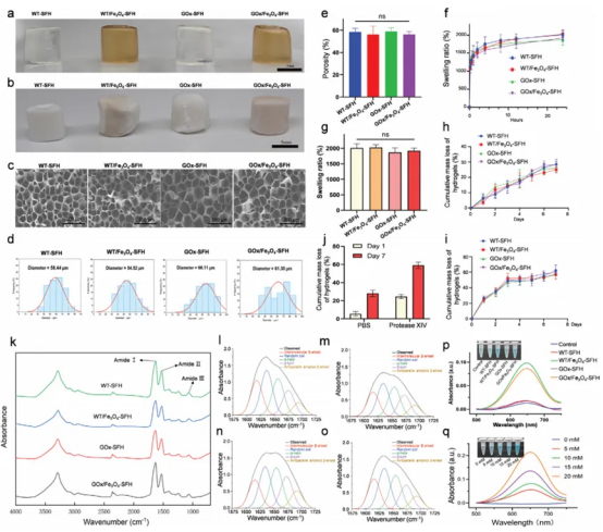 四氧化三鐵納米顆粒能夠進(jìn)一步催化H2O2生成抗菌活性羥基,將其與GOx-silk結(jié)合能進(jìn)一步提高抗菌性。研究者制備了GOx/Fe3O4-SFH水凝膠,光學(xué)透明,形態(tài)均勻,凍干后具有結(jié)構(gòu)完整,具有3D互通多孔結(jié)構(gòu),孔徑30-90μm,孔隙率超55%(圖6a-e)。GOx/Fe3O4-SFH水凝膠吸水能力強(qiáng),能夠快速溶脹,24h溶脹率可達(dá)2000%,體外能夠快速降解,PBS中8天降解25%(圖6f-i)。以上表明該水凝膠適合作為軟組織工程的三維基質(zhì)。水凝膠中引入Fe3O4后,級(jí)聯(lián)催化反應(yīng)表明GOx能夠有效催化葡萄糖生成H2O2,并通過Fe3O4進(jìn)一步催化H2O2為·OH(圖6q)。