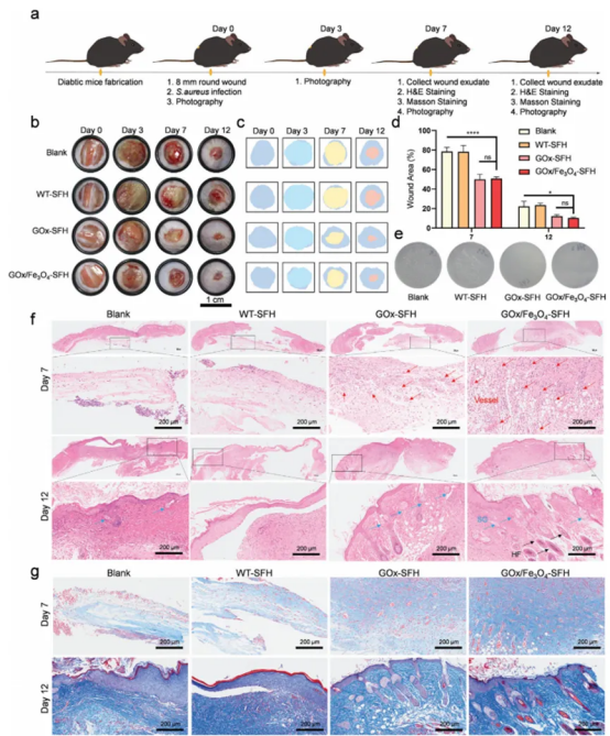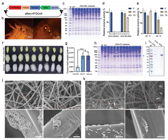 葡萄糖氧化酶(GOx)是一種結(jié)合葡萄糖并催化其轉(zhuǎn)化為葡萄糖酸和過氧化氫(H2O2)的天然酶,被認(rèn)為是糖尿病創(chuàng)面中抗菌和調(diào)節(jié)高糖微環(huán)境的候選酶。因此對(duì)于開發(fā)一種能夠合成GOx、固定GOx、保持GOx活性,實(shí)現(xiàn)可控GOx釋放的載體需求很高。為實(shí)現(xiàn)GOx在家蠶絲中的高效表達(dá),研究者將黑曲霉GOx成熟肽編碼序列根據(jù)家蠶的密碼子使用偏好進(jìn)行優(yōu)化,并插入到HFRSEXP中形成轉(zhuǎn)基因表達(dá)載體pBac-HFGOxS(圖4a)。隨后,將pBac-HFGOxS微注射到家蠶胚胎中,生成可持續(xù)表達(dá)GOx的可遺傳轉(zhuǎn)基因家蠶。獲得的蠶絲中GOx含量可達(dá)80g/kg,活性達(dá)32000U/g蠶絲,GOx穩(wěn)定性大幅提高(圖4c-e)。如圖4f-i,研究者將上述轉(zhuǎn)基因蠶與富絲和棉繭蠶品系多次雜交,實(shí)現(xiàn)含GOx蠶絲的大量生產(chǎn)(含1.38g GOx/1kg蠶絲,純度超95%,活性達(dá)425U/mg)。