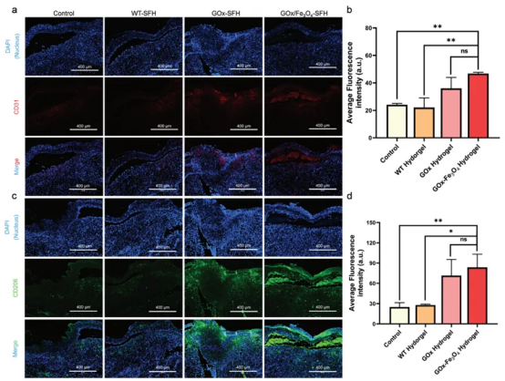 研究者采用糖尿病小鼠模型,如圖8a所示,在小鼠背部切除皮膚形成直徑8mm的全厚度傷口,金黃色葡萄球菌感染30min后,將GOx/Fe3O4-SFH水凝膠覆蓋在傷口上。12天后,GOx/Fe3O4-SFH水凝膠傷口僅剩余11.14%沒有愈合,未愈合傷口處幾乎檢測(cè)不到金黃色葡萄球菌(圖8b-e)。H&E結(jié)果顯示傷口處出現(xiàn)相對(duì)連續(xù)和扁平的上皮細(xì)胞,真皮層發(fā)育良好,并存在毛囊和皮脂腺(圖8f),Masson結(jié)果顯示膠原纖維交織排列(圖8g),免疫熒光結(jié)果顯示組織中CD31(血管生成標(biāo)記物)和CD206(M2標(biāo)記物)顯著增強(qiáng),表明血管生成加速,巨噬細(xì)胞從M1型向M2型極化(圖9)。綜上,GOx/Fe3O4-SFH水凝膠能夠有效抑制金黃色葡萄球菌的生長(zhǎng),從而顯著促進(jìn)慢性傷口愈合。