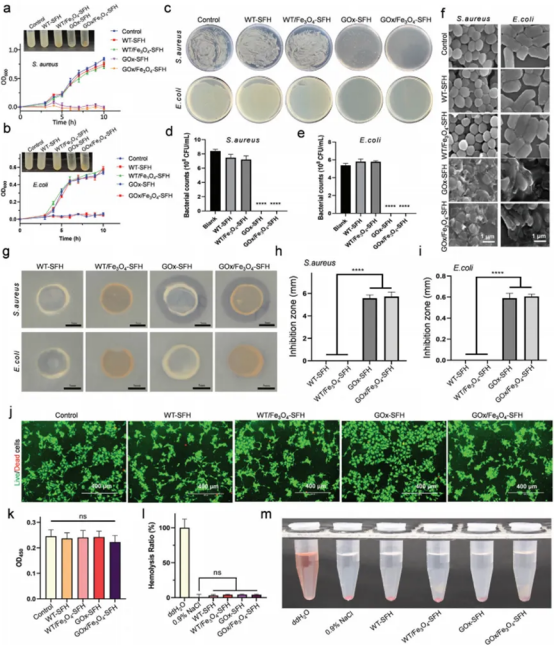 將金黃色葡萄球菌和大腸桿菌的培養(yǎng)液與GOx/Fe3O4-SFH水凝膠共培養(yǎng)10h,結(jié)果表明GOx/Fe3O4-SFH水凝膠能夠顯著抑制金黃色葡萄球菌和大腸桿菌的生長(zhǎng),掃描電鏡顯示菌體表面不規(guī)則、萎縮,表明細(xì)菌死亡(圖7a-i)。GOx/Fe3O4-SFH水凝膠以100μg/mL劑量處理NIH-3T3細(xì)胞,沒有明顯的細(xì)胞死亡,CCK8實(shí)驗(yàn)進(jìn)一步表明GOx/Fe3O4-SFH水凝膠與NIH-3T3細(xì)胞具有良好的相容性(圖7j-k)。GOx/Fe3O4-SFH水凝膠與紅細(xì)胞接觸后未觀察到溶血現(xiàn)象,說明水凝膠具有良好的血液相容性(圖7l-m)。