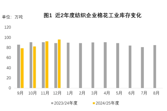 12月,國內(nèi)棉紡織需求持續(xù)走弱,企業(yè)銷售轉(zhuǎn)淡,成品庫存不斷增加,對春節(jié)后訂單信心不足,部分企業(yè)通過下調(diào)產(chǎn)能以應(yīng)對經(jīng)營壓力,全月棉紗和棉布產(chǎn)量有所下降。月內(nèi)棉花價格下跌,紗線企業(yè)逢低采購,原料庫存略有上升。據(jù)中國棉花預(yù)警系統(tǒng)對全國90余家定點(diǎn)紡織企業(yè)調(diào)查顯示,本月紡織企業(yè)開工及產(chǎn)能環(huán)比略有下降,成品累庫現(xiàn)象加重,棉紗價格持續(xù)下跌,棉花庫存有所上升。