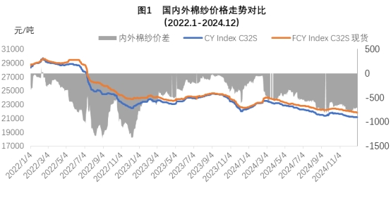 本月內(nèi)外棉紗價格均價繼續(xù)下跌,國產(chǎn)32支純棉紗12月均價為21210元/噸,環(huán)比下跌了285元,跌幅1.3%,同比下跌了1065元,跌幅4.8%;進(jìn)口32支純棉紗12月均價21961元/噸,環(huán)比下跌了225元,跌幅1%,同比下跌了631元,跌幅2.8%。