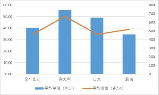 3、粗梳羊絨織物在2022和2023連續(xù)兩年保持出口增長后,2024年有所下降,全年累計出口8.53萬米,同比下降25.61%,累計金額445.85萬美元,下降3.62%。產(chǎn)品規(guī)格和結(jié)構(gòu)有所變化,平均單件重量顯著上升,增幅39.13%,帶動平均單價上漲29.59%,為52.29美元/米,達到近5年高位。高價值、偏厚重產(chǎn)品的出口占比增加,反映出市場競爭力和產(chǎn)品結(jié)構(gòu)均有所調(diào)整。