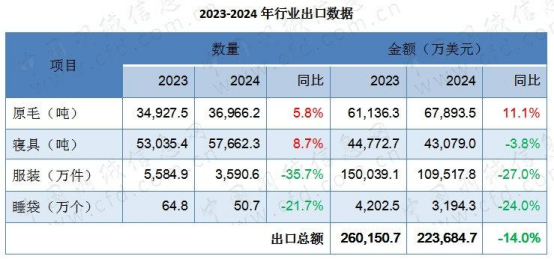 2024年,中國羽絨行業(yè)出口總金額約22.4億美元,同比下降約14.0%,下滑趨勢明顯,但較上一年度下降幅度縮窄10.2%。其中原毛出口略有增長,出口額6.8億美元,較2023年增長一成,占行業(yè)出口總額的30.4%。羽絨服裝出口下滑明顯,出口額約11億美元,占行業(yè)出口總額的49.0%。羽絨寢具出口量小幅增長,出口額占行業(yè)出口總額的19.3%。