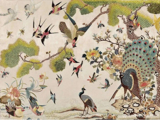 廣繡因其外銷需求,使其繡品一定程度上吸收西方審美趣味以迎合西方消費(fèi)者,因此廣繡在飽滿均勻構(gòu)圖基礎(chǔ)上又格外注重透視、虛實(shí)、空間層次的處理以及光線的折射細(xì)節(jié)效果,造型也更趨于寫實(shí)。