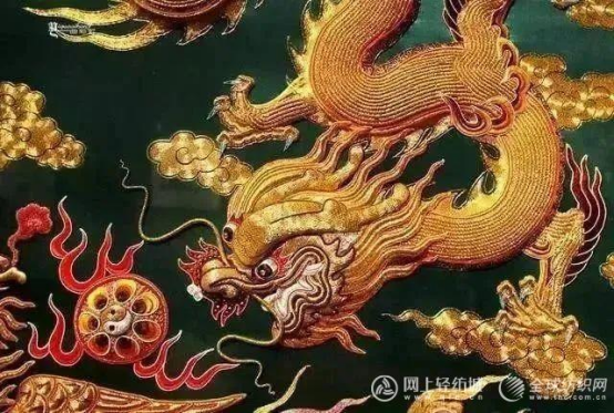 “金銀線繡”需要依靠絨線“釘針”固緊,因此也稱作“釘金”、“盤金”,龍鳳裙褂是“金銀線繡” 的典型代表,一針一線繡滿對(duì)新人的祝福。