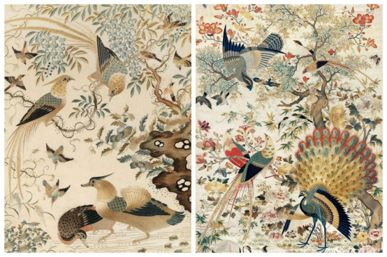 廣繡在色彩方面完美呈現(xiàn)了“中西結(jié)合”的藝術(shù)風(fēng)韻,色彩鮮亮與淡雅兼具,裝飾感尤為強(qiáng)烈,但色彩運(yùn)用更加注重明暗關(guān)系、明度與純度關(guān)系的變化。