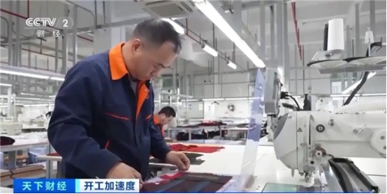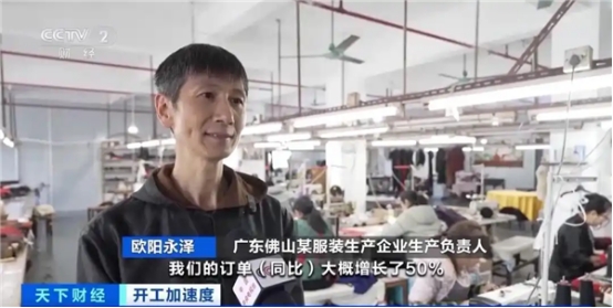 廣東佛山某服裝生產(chǎn)企業(yè)生產(chǎn)負責人 歐陽永澤:我們開工提前了一周。今年一月份到現(xiàn)在,我們的訂單同比大概增長了50%?,F(xiàn)在我們工人缺口還是蠻大的。
