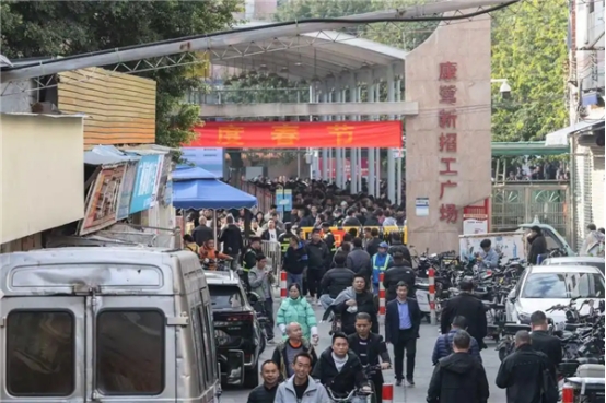 往年,制衣廠老板常在城中村內(nèi)的巷道上排隊招工。2023年,當?shù)貑⒂昧诵抡泄V場,現(xiàn)場設置招工站位區(qū)、找工通道、服務前臺,有序引導供需雙方,還通過場內(nèi)白板、電子屏幕、語音廣播等渠道收集、發(fā)布崗位。
