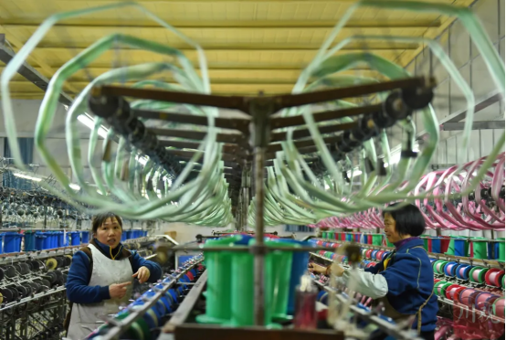 2025年2月12日,在位于四川省南充市嘉陵工業(yè)集中區(qū)的四川順成紡織有限公司紡織車間,工人正在翻絲。