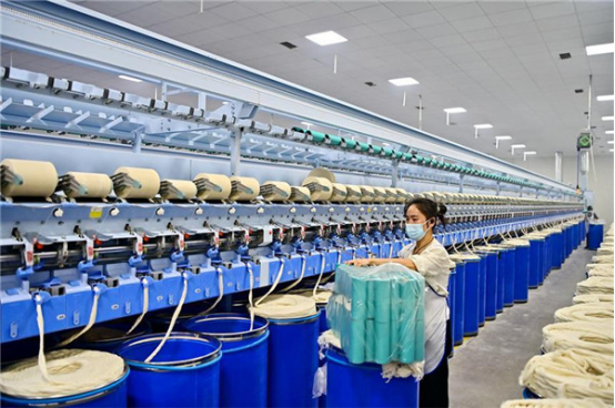 近日,江西省宜春市上高縣工業(yè)園區(qū)的一家民營紡織企業(yè)車間內(nèi),工人在智能紡紗生產(chǎn)線上加工出口訂單產(chǎn)品。