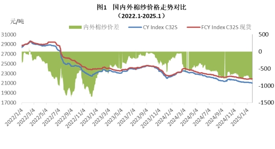 國產(chǎn)32支純棉紗1月均價為21113元/噸,環(huán)比下跌97元,跌幅0.5%,同比下跌1652元,跌幅7.3%;進口32支純棉紗1月均價21883元/噸,環(huán)比下跌77元,跌幅0.4%,同比下跌1027元,跌幅4.5%。