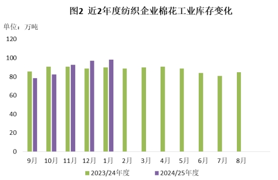 月內(nèi)成品去庫顯著,棉紡織企業(yè)資金壓力有所緩解,部分企業(yè)適當采購皮棉,原料庫存穩(wěn)中有升。截至1月31日,紡織企業(yè)在庫棉花工業(yè)庫存量為98萬噸,環(huán)比增加1.1萬噸,同比增加8.3萬噸。其中:32%的企業(yè)增加棉花庫存,25%減少庫存,43%基本保持不變。