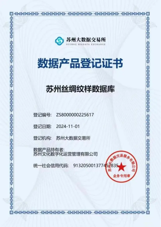 2024年,“蘇州絲綢紋樣數(shù)據(jù)集”完成階段開發(fā),首批絲綢紋樣入庫,并在蘇州大數(shù)據(jù)交易所上架,為江蘇省首款上架交易的絲綢紋樣數(shù)據(jù)產(chǎn)品?!岸S圖像矢量化技術(shù)要求”入選江蘇省地方標(biāo)準(zhǔn)制定項目?!敖z綢紋樣數(shù)字化創(chuàng)新應(yīng)用”獲評首批江蘇人文經(jīng)濟(jì)入庫案例,并入選江蘇省文化和科技融合生態(tài)匯“靈境·2024”文化大數(shù)據(jù)優(yōu)秀案例。