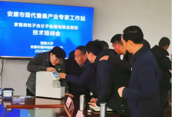 家蠶微粒子病是嚴重危害蠶種生產(chǎn)的傳染性疫病,可導致蠶桑生產(chǎn)減產(chǎn)甚至絕收,給蠶農(nóng)造成巨大的經(jīng)濟損失。潘國慶團隊長期致力于家蠶微粒子病防控技術研究,在病源生物學、檢測技術、綜合防治等方面取得了一系列重要成果。此次考察期間,專家團隊深入蠶種生產(chǎn)車間、質(zhì)量檢驗室,詳細了解安康市蠶種場有限公司家蠶微粒子病發(fā)生現(xiàn)狀和防控措施;雙方就家蠶微粒子孢子形態(tài)變化、致病機理、檢測技術進化、防控技術演進、質(zhì)量標準驗證等進行了座談交流。潘國慶研究員一行還應邀給公司的專業(yè)技術人員做了學術報告,生動的講解微孢子蟲分類、感染機制,核酸檢測方法等知識,現(xiàn)場演示了分子檢測設備使用方法。