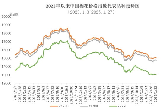 1月,新棉加工量持續(xù)增加,市場供應寬松,月初國內(nèi)棉價延續(xù)前期下跌趨勢,中國棉花價格指數(shù)(CCIndex3128B)最低跌至14630元/噸。隨后,央行等部門釋放積極政策信號,提振市場情緒,棉價逐漸反彈至14814元/噸。月末,受春節(jié)假期影響,購銷市場基本停滯,棉價略有回落。1月中國棉花價格指數(shù)(CCIndex3128B)月均價14721元/噸,環(huán)比下跌228元,同比下跌1969元。