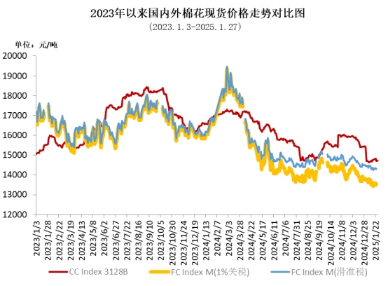2025年1月,國內(nèi)棉花市場呈現(xiàn)先跌后漲的走勢。月初,新棉供應持續(xù)增加,現(xiàn)貨價格小幅回落;中旬,隨著宏觀政策預期轉(zhuǎn)暖,棉紡織廠對后市持樂觀態(tài)度,適度補充原料庫存,推動棉價上漲;下旬,受春節(jié)假期影響,紡織廠陸續(xù)放假,市場成交轉(zhuǎn)淡,棉價略有回落。同期,受美元指數(shù)沖高回落、USDA報告上調(diào)全球產(chǎn)量等因素影響,國際棉價震蕩下跌,內(nèi)外棉價差隨之波動。