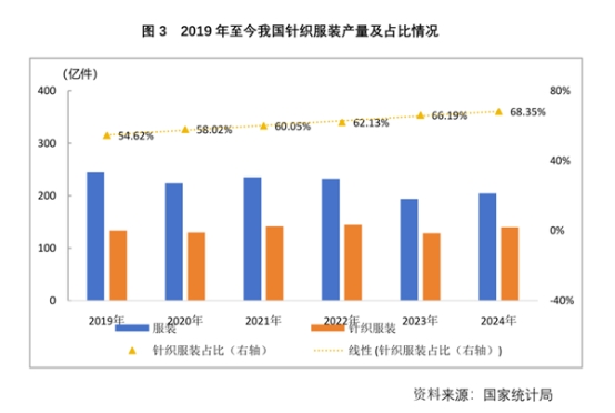 產(chǎn)量方面,2024年我國服裝產(chǎn)量同比增長4.22%;其中針織服裝產(chǎn)量同比增長7.38%。針織服裝產(chǎn)量占服裝總產(chǎn)量的比重達68.35%,較2019年提高了13.91個百分點。隨著消費習慣的轉(zhuǎn)變、消費場景的不斷創(chuàng)新、材料和生產(chǎn)工藝持續(xù)發(fā)展,拓寬了針織產(chǎn)品的應用邊界,進一步推動了針織服飾產(chǎn)品的開發(fā)與應用水平。