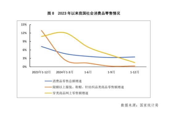 2024年我國紡織服裝商品內(nèi)需消費實現(xiàn)溫和增長,但受到宏觀經(jīng)濟放緩影響,各項內(nèi)銷指標增速均較上年有所放緩。國家統(tǒng)計局數(shù)據(jù)顯示,2024年我國限額以上服裝、鞋帽、針紡織品類商品零售額為14691億元,同比增長0.3%,增速較上年回落12.6個百分點;實物商品網(wǎng)上穿類商品零售額同比增速為1.5%,增速較上年回落9.3個百分點。
