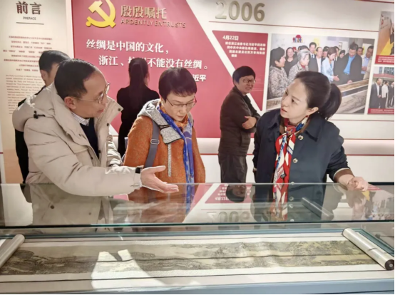 調(diào)研考察組成員首先在杭州萬(wàn)事利絲綢文化股份有限公司新整合BU教育培訓(xùn)項(xiàng)目總監(jiān)黃薇、萬(wàn)事利絲綢教育項(xiàng)目部副總監(jiān)高敏、項(xiàng)目部付澤偉等陪同下參觀了萬(wàn)事利科創(chuàng)中心幾個(gè)展區(qū),黃薇總監(jiān)等向調(diào)研考察組成員介紹了萬(wàn)事利集團(tuán)的發(fā)展歷程、品牌建設(shè)、文化創(chuàng)新、科技創(chuàng)新、模式創(chuàng)新、黨建引領(lǐng)等方面的詳細(xì)情況。