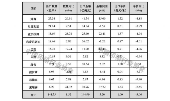 表1 2024年我國(guó)印染八大類產(chǎn)品出口前十國(guó)家情況