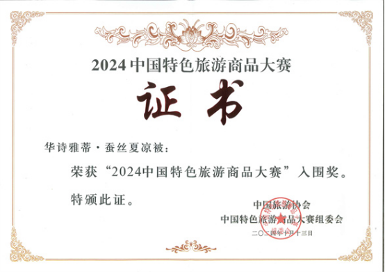 在2024年中國(guó)特色旅游商品大賽暨中國(guó)旅游商品大賽上,華詩(shī)雅蒂創(chuàng)新研發(fā)的蠶絲夏涼被,憑借卓越品質(zhì)與獨(dú)特設(shè)計(jì),在眾多參賽商品中嶄露頭角,最終榮獲“2024年中國(guó)特色旅游商品大賽”入圍獎(jiǎng)。