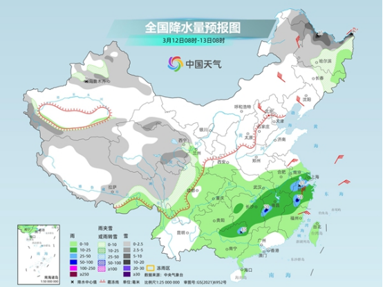 今起至周末,南方將有大范圍降雨天氣,江南、華南部分地區(qū)雨勢較強,或現(xiàn)暴雨,上述地區(qū)局地伴有短時強降水、雷暴大風(fēng)等強對流天氣。此外,今天黑龍江、內(nèi)蒙古東部多地仍有降雪,需警惕積雪和道路結(jié)冰對交通的不利影響。