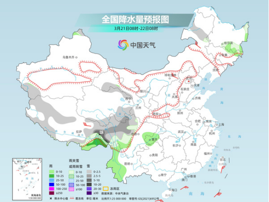 后天,新疆北疆北部、西藏中南部、川西高原中北部以及內(nèi)蒙古東北部等地部分地區(qū)有小到中雪或雨夾雪,其中,新疆北疆北部、西藏東部等地部分地區(qū)有大雪,局地暴雪。新疆北疆低海拔地區(qū)、西藏東南部、四川南部、重慶中南部、湖北西南部、貴州北部、云南西北部和東北部等地部分地區(qū)有小雨,其中,西藏東南部等地部分地區(qū)有中雨。