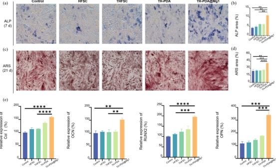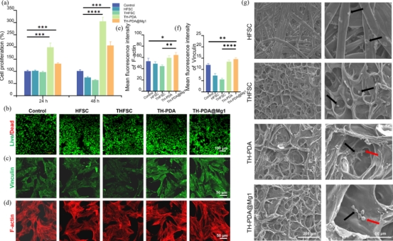 細(xì)胞毒性試驗(yàn)(圖a)表明,引入PDA后具有提升的細(xì)胞活力,適量加入Mg2+對(duì)于細(xì)胞活性也有提升。使用TH-PDA@Mg1作為支架組別,該組別活死染色(圖b-f)展現(xiàn)出良好的生物相容性和最小的細(xì)胞毒性。從細(xì)胞在支架上的粘附情況(圖g)可以看出,TH-PDA和TH-PDA@Mg1支架明顯促進(jìn)成骨細(xì)胞的粘附,表面細(xì)胞呈拉長(zhǎng)和分散的狀態(tài),具有絲狀偽足和片狀偽足的延伸。這可能與支架表面結(jié)構(gòu)變化及增強(qiáng)的細(xì)胞-物質(zhì)相互作用有關(guān)。