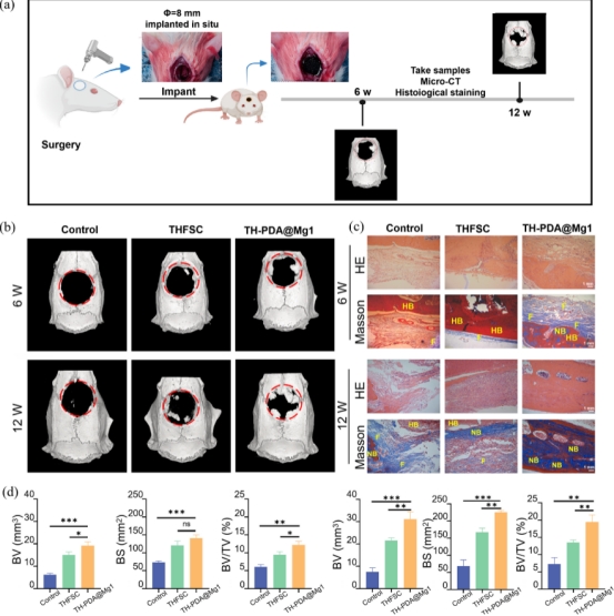 該研究團(tuán)隊(duì)通過將FSC與PDA和Mg2+集成用于骨缺損修復(fù),開發(fā)了一種具有良好生物相容性的多功能復(fù)合支架。該方案簡(jiǎn)化了絲素蛋白材料制備流程并降低成本,PDA和Mg2+的摻入顯著增強(qiáng)了MC3T3-E1細(xì)胞的增殖、遷移和成骨分化。TH-PDA@Mg1支架還促進(jìn)了巨噬細(xì)胞從M1促炎表型向M2促重構(gòu)表型的轉(zhuǎn)化,在顱骨缺損模型中表現(xiàn)出優(yōu)越的骨修復(fù)效果。具有促進(jìn)成骨細(xì)胞增殖和分化、巨噬細(xì)胞極化和體內(nèi)血管化等優(yōu)點(diǎn),表明材料在一系列的骨科應(yīng)用中具有巨大的潛力,除應(yīng)對(duì)不同大小的骨缺損以外,還可用于治療炎癥性骨病或促進(jìn)傷口愈合。未來將這種支架與藥物傳遞系統(tǒng)或生長(zhǎng)因子結(jié)合,可以實(shí)現(xiàn)靶向治療,并進(jìn)一步提高其再生潛力。目前的研究證明了基于FSC的支架的成骨和免疫調(diào)節(jié)潛力,未來的工作應(yīng)集中于改進(jìn)FSC支架制造工藝,同時(shí)優(yōu)化其制備方法,闡明其作用機(jī)制,并探索高價(jià)值利用和大規(guī)模采用的多功能應(yīng)用。