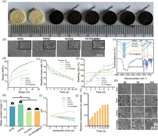 使用三元溶液處理熱壓過的平板絲(FSC)表面,得到THFSC,再室溫浸泡于含不同濃度硫酸鎂的多巴胺溶液中24h,得到各組含鎂樣品,改性后的支架由白色變?yōu)樯钭厣▓Da)。從應(yīng)力-應(yīng)變曲線(圖d)可以看出,Mg2+加載后,支架力學(xué)性能得到提升。同時(shí),支架的降解速率得到減緩,溶脹率提高,表明PDA的存在增強(qiáng)了支架的親水性和結(jié)構(gòu)穩(wěn)定性(圖e、圖f、圖h)。模擬體液SBF的生物礦化實(shí)驗(yàn)(圖k)中,在TH-PDA和TH-PDA@Mg1組別的表面上觀察到明顯的磷灰石形成,表面修飾后促進(jìn)羥基磷灰石(HA)形成的能力增強(qiáng)。這種HA層的有效形成可能基于SBF中離子和PDA中的兒茶酚胺基團(tuán)之間存在強(qiáng)大的相互作用。