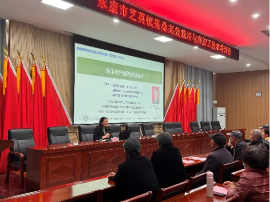 徐玉娟一行前往永康市、武義縣開展蠶桑產(chǎn)業(yè)考察調(diào)研與技術(shù)指導(dǎo)服務(wù),組織了現(xiàn)場(chǎng)研討會(huì)及永康示范縣果桑高效栽培與深加工技術(shù)培訓(xùn)會(huì),并做了《桑果全產(chǎn)業(yè)鏈關(guān)鍵技術(shù)》專題培訓(xùn),詳細(xì)介紹了桑果營(yíng)養(yǎng)功能價(jià)值及由桑果精深加工產(chǎn)業(yè)趨勢(shì)及健康食品開發(fā)情況,團(tuán)隊(duì)聚焦品種創(chuàng)制、技術(shù)突破、產(chǎn)品創(chuàng)制、工程化應(yīng)用等方面構(gòu)建的桑果全產(chǎn)業(yè)鏈技術(shù)體系及產(chǎn)業(yè)化系列成果。