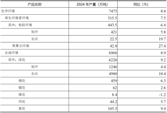 在產能高基數和高開工的情況下,2024年化纖產量較快增長。根據中國化纖協(xié)會統(tǒng)計,2024年化纖產量為7475萬噸,同比增長8.8%(表1)。其中,滌綸長絲和氨綸產量同比分別增長10%左右,錦綸產量同比增長6.3%,粘膠短纖產量同比增長5.8%,萊賽爾纖維產量同比增幅達27.4%。