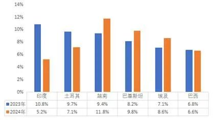根據中國海關數據,2024年,化纖產品共出口665萬噸,同比增長2.16%(表2),全年恢復增長態(tài)勢。分出口目的地看,對印度出口減量影響較大。2023年10月印度對滌綸長絲執(zhí)行BIS認證,企業(yè)在此前搶出口,致使2023年滌綸長絲出口量大增。2024年滌綸長絲出口沒能延續(xù)上年的高增長態(tài)勢,全年出口量同比減少2.50%。如果刨除印度,對其他國家和地區(qū)出口滌綸長絲實際是增長的。此外,化纖出口市場份額變化明顯(圖1),印度、土耳其份額分別下降5.6、2.6個百分點,越南、巴基斯坦、埃及份額有明顯提升。