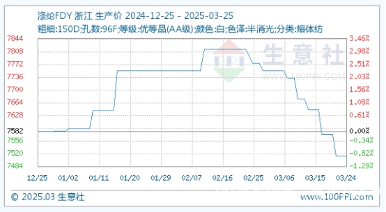 3月25日,滌綸FDY基準(zhǔn)價為7514.00元/噸,與本月初(7754.00元/噸)相比,漲跌幅為-3.10%。