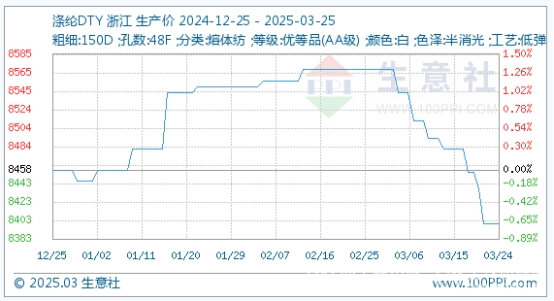 3月25日,滌綸DTY基準(zhǔn)價為8400.00元/噸,與本月初(8568.75元/噸)相比,漲跌幅為-1.97%。