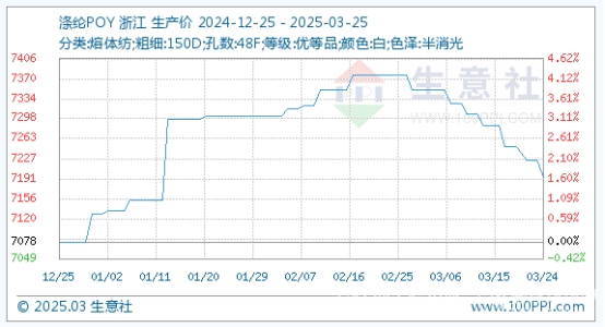 3月25日,滌綸POY基準(zhǔn)價為7193.75元/噸,與本月初(7351.25元/噸)相比,漲跌幅為-2.14%。