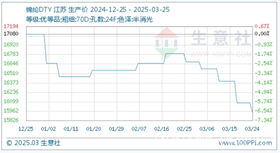 3月25日,錦綸DTY基準(zhǔn)價為15940.00元/噸,與本月初(16680.00元/噸)相比,漲跌幅為-4.44%。