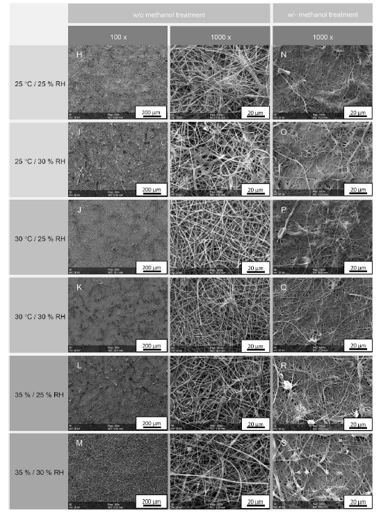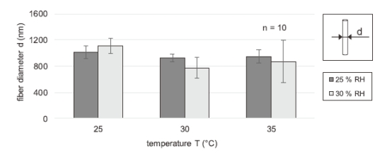 纖維形貌:25°C、30% RH:纖維表面液滴增多,直徑標(biāo)準(zhǔn)差大。35°C、30% RH:纖維直徑差異最大(418 nm),結(jié)構(gòu)松散。30°C、25% RH:纖維最均勻(998±63 nm),無缺陷(圖2)。