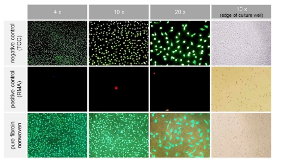 細(xì)胞毒性實驗表明:純絲素蛋白非織造布的細(xì)胞代謝活性與陰性對照組(TCC)無顯著差異(p>0.05),遠(yuǎn)高于陽性對照組(含ZDEC的聚氨酯膜)。染色顯示,纖維表面細(xì)胞存活率>95%,形態(tài)舒展,無毒性跡象(圖4)。