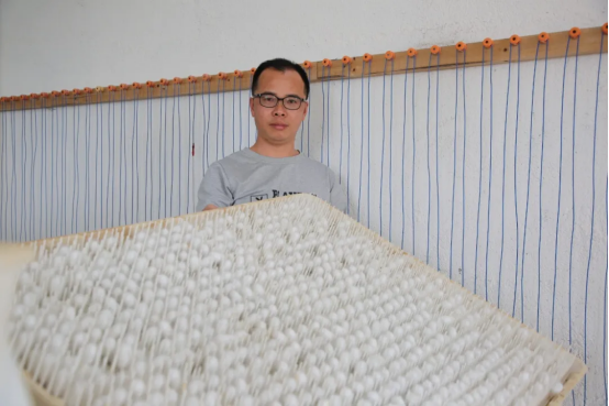 在溫室標(biāo)準(zhǔn)化蠶房內(nèi),先進(jìn)的釘釘蔟發(fā)揮著神奇作用,蠶寶寶能夠自動上蔟結(jié)繭,成果繭率高達(dá)98%。放眼望去,蔟上布滿了白皚皚的蠶繭,豐收景象喜人,預(yù)示著收獲季的到來。