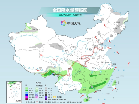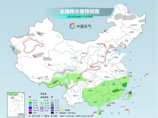 今天至31日,南方仍會維持多陰雨的天氣格局,其中今天華南部分地區(qū)伴隨降雨還可能出現強對流天氣,明天起南方則以穩(wěn)定性降水為主。