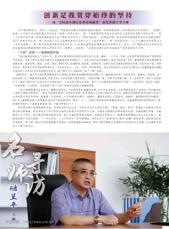在中國(guó)絲綢業(yè)內(nèi),有這么一家企業(yè),憑借超前的眼光和持續(xù)創(chuàng)新的精神,如集郵般獲得一系列國(guó)家級(jí)認(rèn)定和獎(jiǎng)項(xiàng)——絲綢行業(yè)第一個(gè)農(nóng)業(yè)產(chǎn)業(yè)化國(guó)家重點(diǎn)龍頭企業(yè)(國(guó)家八部委認(rèn)定)、第一個(gè)國(guó)家循環(huán)經(jīng)濟(jì)試點(diǎn)示范單位(國(guó)家發(fā)改委等六部委認(rèn)定)、第一個(gè)且是行業(yè)內(nèi)唯一的國(guó)家桑蠶繭絲產(chǎn)業(yè)工程技術(shù)研究中心(科技部批準(zhǔn)),絲綢業(yè)內(nèi)唯一的全國(guó)繭絲綢服裝家紡知名品脾創(chuàng)建示范區(qū)(質(zhì)檢總局認(rèn)定)、唯一的全國(guó)工業(yè)企業(yè)品牌培育試點(diǎn)示范企業(yè)(工信部表彰)、唯一的全國(guó)農(nóng)村一二三產(chǎn)業(yè)融合發(fā)展領(lǐng)軍全業(yè)(農(nóng)業(yè)部表彰)、唯一的中國(guó)質(zhì)量獎(jiǎng)提名獎(jiǎng)獲獎(jiǎng)企業(yè)……這就是鑫緣繭絲綢集團(tuán)股份有限公司。近日,本刊編輯來(lái)到江蘇海安市,采訪(fǎng)鑫緣繭絲綢集團(tuán)股份有限公司黨委書(shū)記、董事長(zhǎng)、總經(jīng)理,“全國(guó)繭絲綢行業(yè)終身成就獎(jiǎng)”獲得者儲(chǔ)呈平大師。