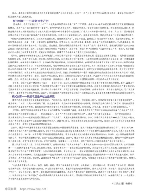 “創(chuàng)新是我貫穿始終的堅(jiān)持。轉(zhuǎn)型、轉(zhuǎn)制、轉(zhuǎn)舵,通過(guò)三轉(zhuǎn)使鑫緣活力增強(qiáng),在此基礎(chǔ)上,抓住科技創(chuàng)新,驅(qū)動(dòng)整個(gè)產(chǎn)業(yè)的升級(jí),同時(shí)通過(guò)品牌的創(chuàng)建,提升企業(yè)的核心競(jìng)爭(zhēng)力,參與國(guó)家標(biāo)準(zhǔn)的制定,來(lái)贏得行業(yè)的地位和話(huà)語(yǔ)權(quán),而參與產(chǎn)業(yè)扶貧、鄉(xiāng)村振興,更為產(chǎn)業(yè)發(fā)展拓展了空間”,儲(chǔ)呈平總結(jié)道。2017年,商務(wù)部調(diào)研組來(lái)到鑫緣集團(tuán),總結(jié)出“鑫緣模式”的典型經(jīng)驗(yàn),通過(guò)專(zhuān)刊《商務(wù)參閱》向全國(guó)推廣。事實(shí)上,獨(dú)具創(chuàng)新魅力的“鑫緣模式”對(duì)中國(guó)繭絲綢產(chǎn)業(yè)發(fā)展具有方向性意義。因地制宜不斷創(chuàng)新發(fā)展新質(zhì)生產(chǎn)力,在鑫緣的踐行中,一個(gè)顛覆性、革命性的桑蠶繭絲新時(shí)代即將來(lái)臨。