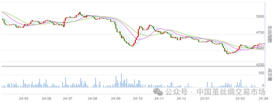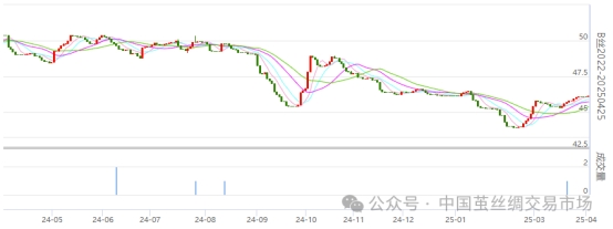 今日(2025年04月02日,周三)中國繭絲綢交易市場生絲電子指數(shù)上漲0.10%報收于4608.25點(diǎn)。B絲2022D(商檢4A級生絲):250425合約上漲0.06萬元報收于46.17萬元;250925合約上漲0.09萬元報收于46.11萬元;260325合約報平收于45.87萬元。